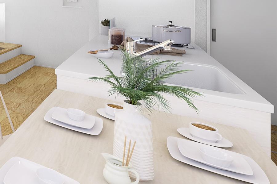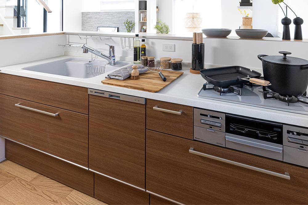 【フルフラットキッチン】機能性とデザイン性を兼ね備えたフルフラットキッチン。広々としたワークスペースは人が集まりやすく、キッチンを中心とした暮らしが楽しめます。※号棟により採用状況が異なります。