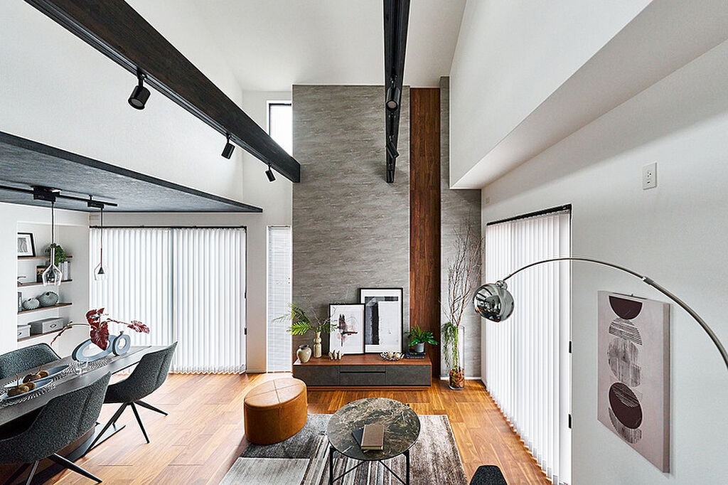 家族のくつろぐリビングの上部に吹抜けをデザイン。縦の開放感や2階との繋がりに加えて、明るさを室内へと呼び込みます。※1号棟/2026年2月撮影