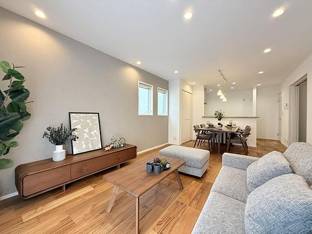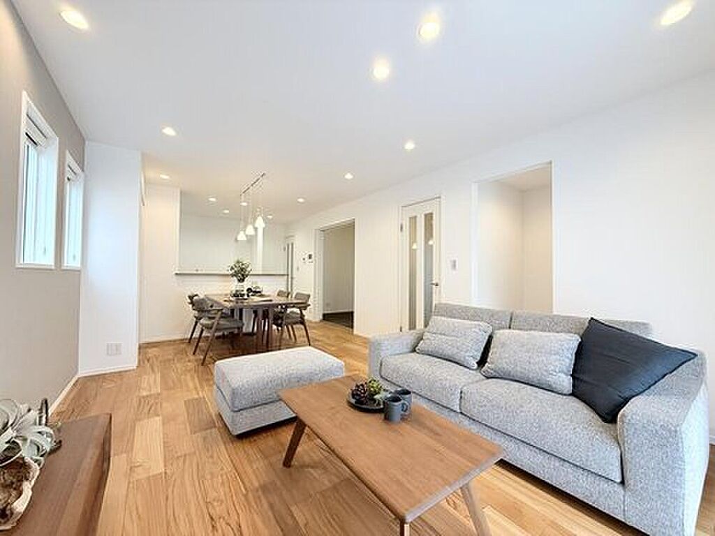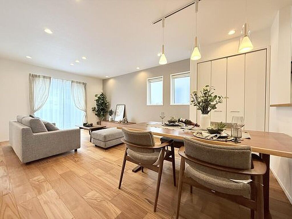17.6帖のLDKはダイニングを中心にリビング・キッチンどちらにも開けているので、家族を身近に感じられるプランです。※2025年10月撮影
