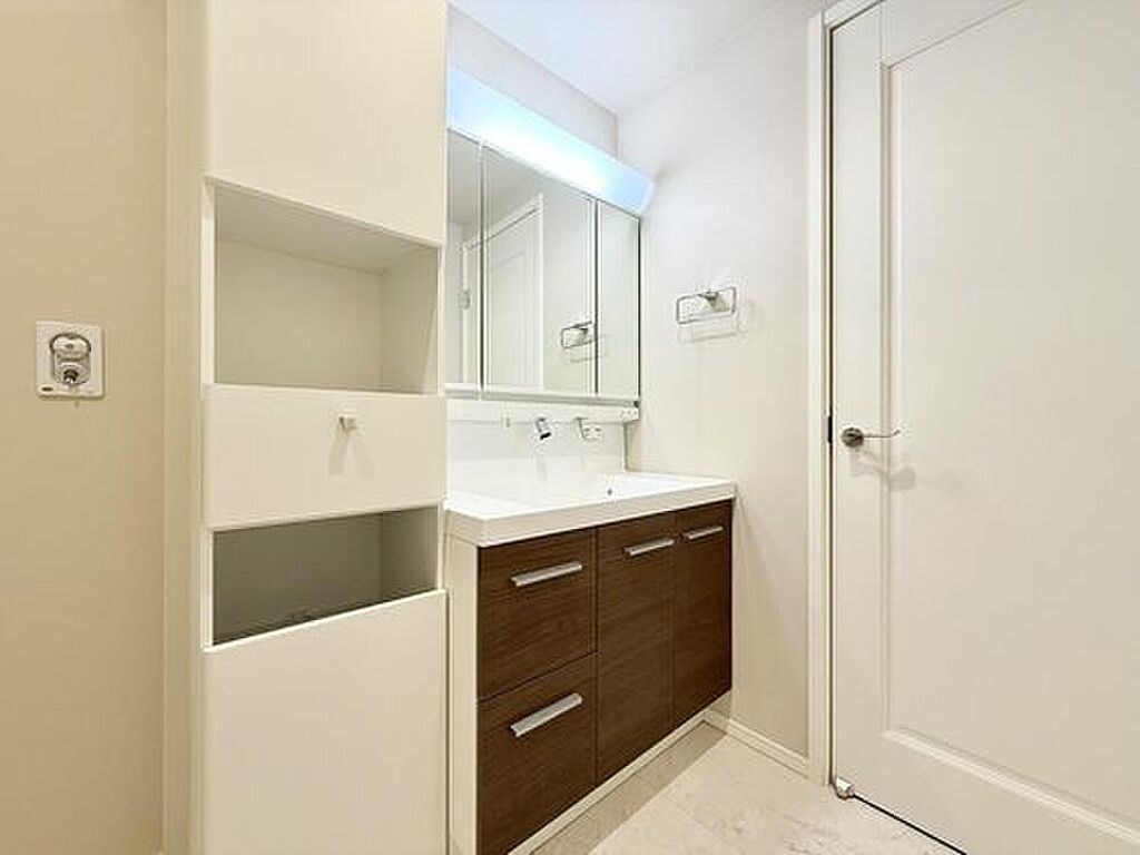 タオルや着替えの収納に便利な当社オリジナル収納棚を備えたサニタリールームです。※2025年10月撮影