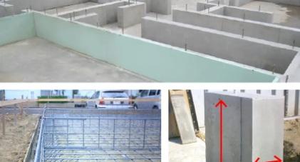 床面と立ち上がり部分が一体となる強固なベタ基礎工法。幅は150mm、高さは400mm。鉄筋はあらかじめ工場でつくることで現場加工による精度のバラツキもなくしています。