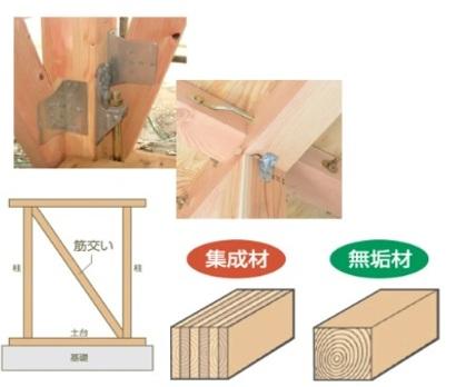 反りやねじれが少く、無垢材比1.5倍の強度を持つ集成材。壁倍率1.25倍の耐力壁やホールダウン・羽子板金物で接合部も強化。