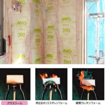 壁・天井に厚さ100mmのグラスウール断熱材を採用。グラスウールは、不燃材料のガラスを主原料としておりガラス繊維の間に大量の静止空気を含んでいるため高い断熱性能を発揮します。