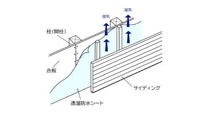 柱などの躯体と外壁材との間に空気が流れる通気層をつくり、壁内結露を防ぎます。透湿防水シートで家全体を包み躯体への水の侵入を防ぎます。