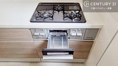 同時調理で時短革命の三口コンロ。同一仕様に基づいてご案内しておりますが、現場状況により仕様と異なる場合がございます。その際は現場の状況を優先させていただきます。