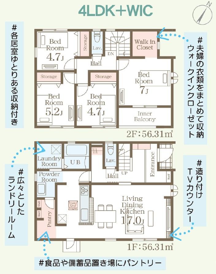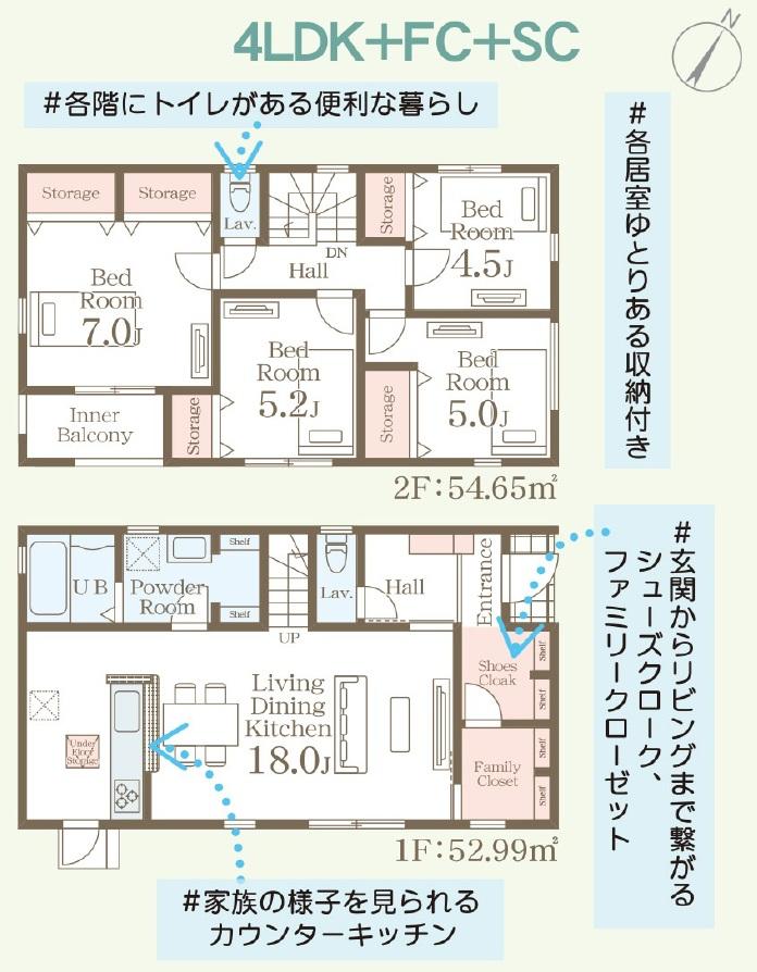 | 建物面積 | 107.64㎡・112.62㎡(32.56坪・34.06坪) | 土地面積 | 166.41㎡・166.67㎡(50.33坪・50.41坪) | ||