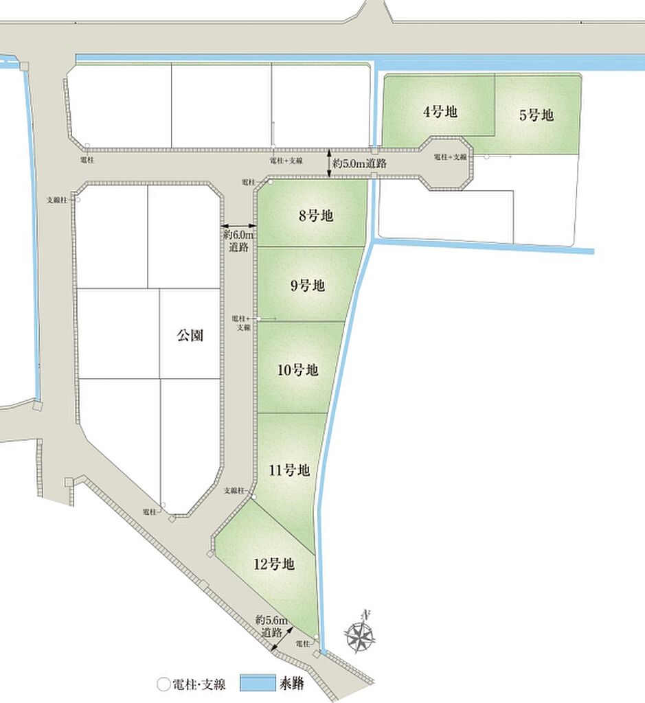 | 建物面積 | - | 土地面積 | 201.58m2(4号地、5号地)~215.89m2(12号地) 全て私道負担なし | ||