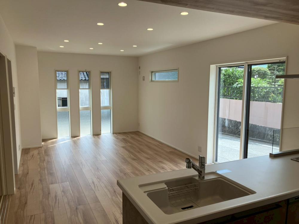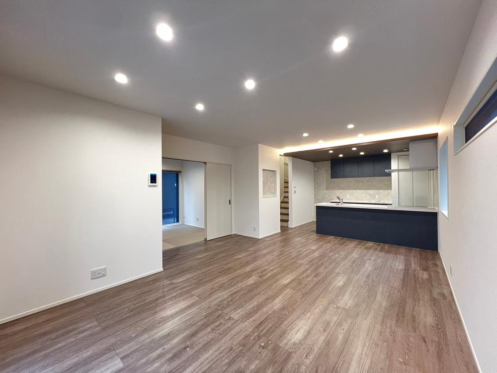 【2号地/リビング】LDKと洋和室を合計すると24.7帖の開放感あふれる空間に!ゆとりある寛ぎ空間をご堪能いただけます。キッチンは人気の対面式で、家族との会話を楽しめます。※2025年10月撮影