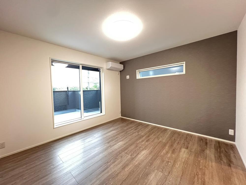 【2号地/主寝室】南向きの明るい主寝室。ブラウンのアクセントクロスが落ち着いた雰囲気を演出します。5.5帖のバルコニーに面しているので、開放的な空間となっています。※2025年10月撮影