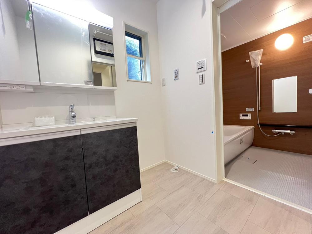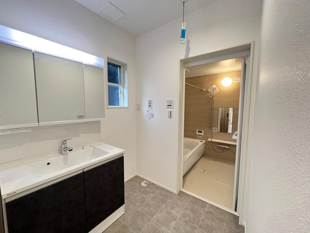 【1号地/浴室】洗面脱衣室・浴室はキッチンと一直線に配置することで、家事の動線あスムーズに♪室内物干し金物を洗面脱衣室に設置しているので、洗濯から干す、取り込むを一箇所で完結。※2025年10月撮影