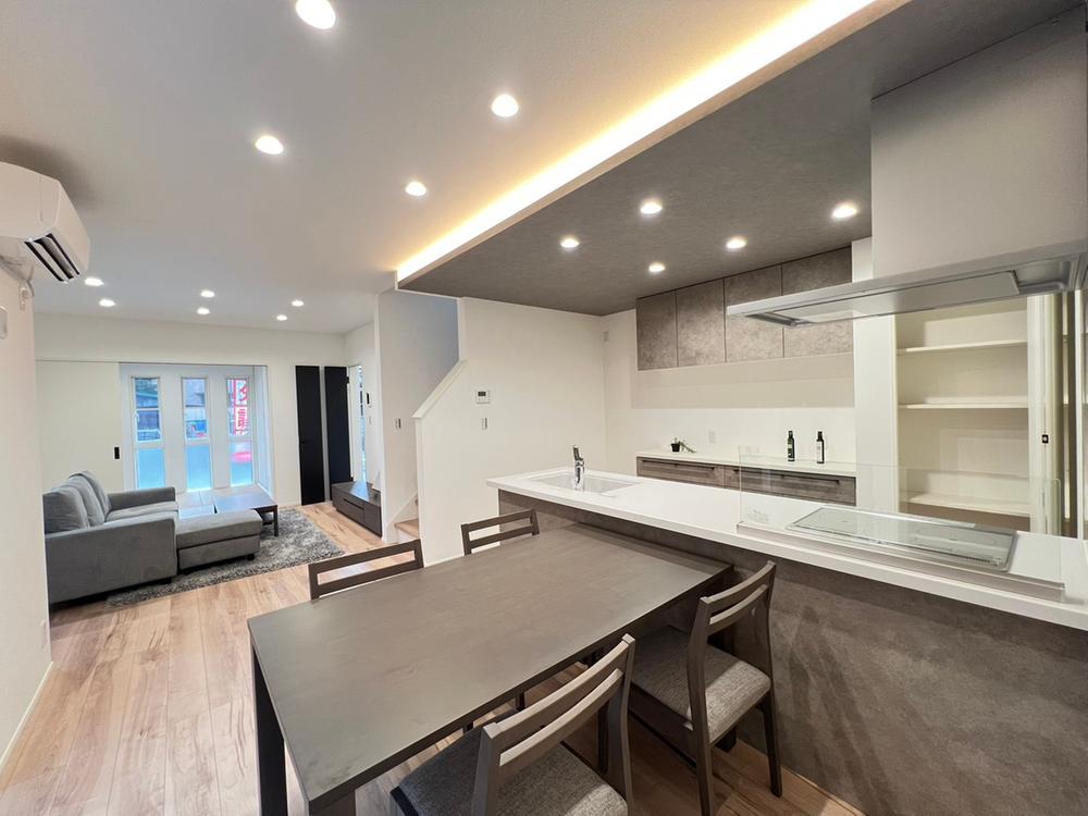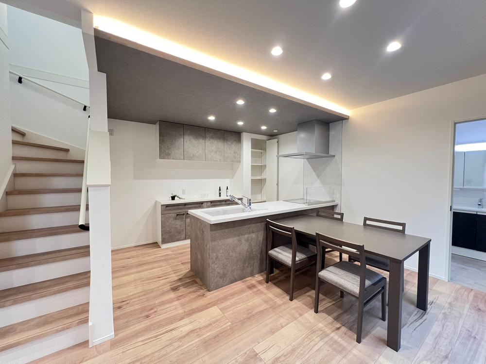 【5号地/キッチン】人気の対面式キッチン。折下天井にコーブ照明を設置し、落ち着いた雰囲気を演出。※設置されております家具家電は展示用です。販売価格には含まれておりません。※2025年10月撮影