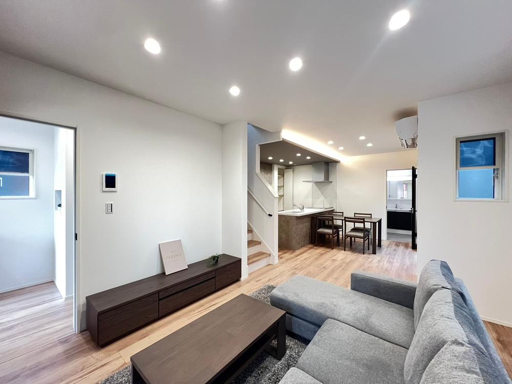 【5号地/リビング】LDKは南向きなので、暖かな陽射しをたっぷり取り込む明るい雰囲気の寛ぎ空間です。※設置されております家具家電は展示用です。販売価格には含まれておりません。※2025年10月撮影