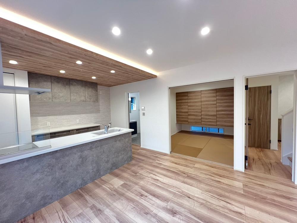 【1号地/キッチン】折下げ天井にはコーブ照明を設置。落ち着いた雰囲気を演出しています。キッチンの隣に洋和室を配置しているので、お子様の様子を見まりながら家事がこなせます。※2025年10月撮影