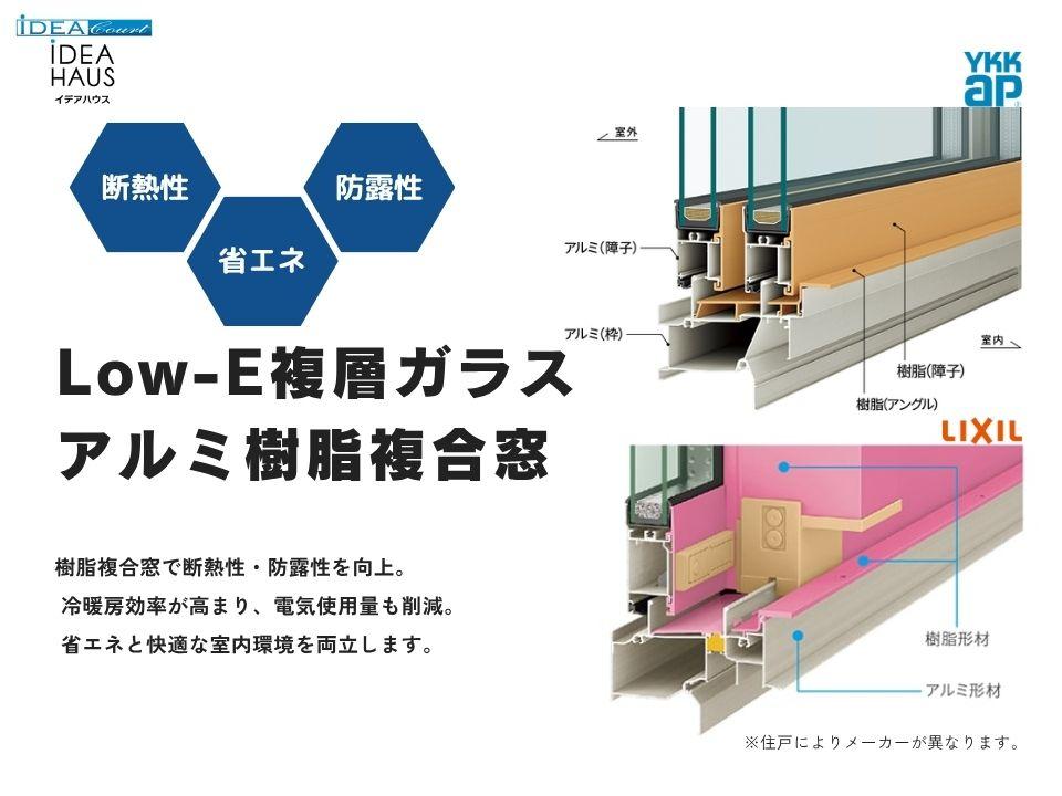 【窓】~アルミと樹脂の複合ハイブリッド構造~Low-E複層ガラス(ペアガラス)+アルミと樹脂を複合させたサッシで圧倒的な断熱性能を実現!アルミ形材を室内側と室外側に分離させ、熱を伝えにくい樹脂部材でつなぐことで熱の伝わりを遮断するサーマルブレイク構造を下枠に採用しています。