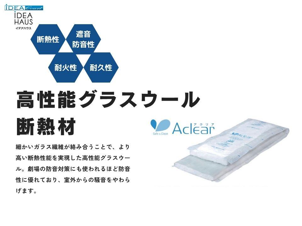 【断熱材】~高性能グラスウール『アクリア』~優れた断熱性能に加え、健康、安全、環境へも配慮した高性能なグラスウール断熱材です。最先端技術で高い断熱性能を実現し、他の断熱材に比べて低コスト!不燃材だから火災時も安心。主原料がガラスなので火に強く、燃えにくい材料です!火災時にも延焼や類焼を最小限に抑えられますし、煙や有毒ガスも発生しません。