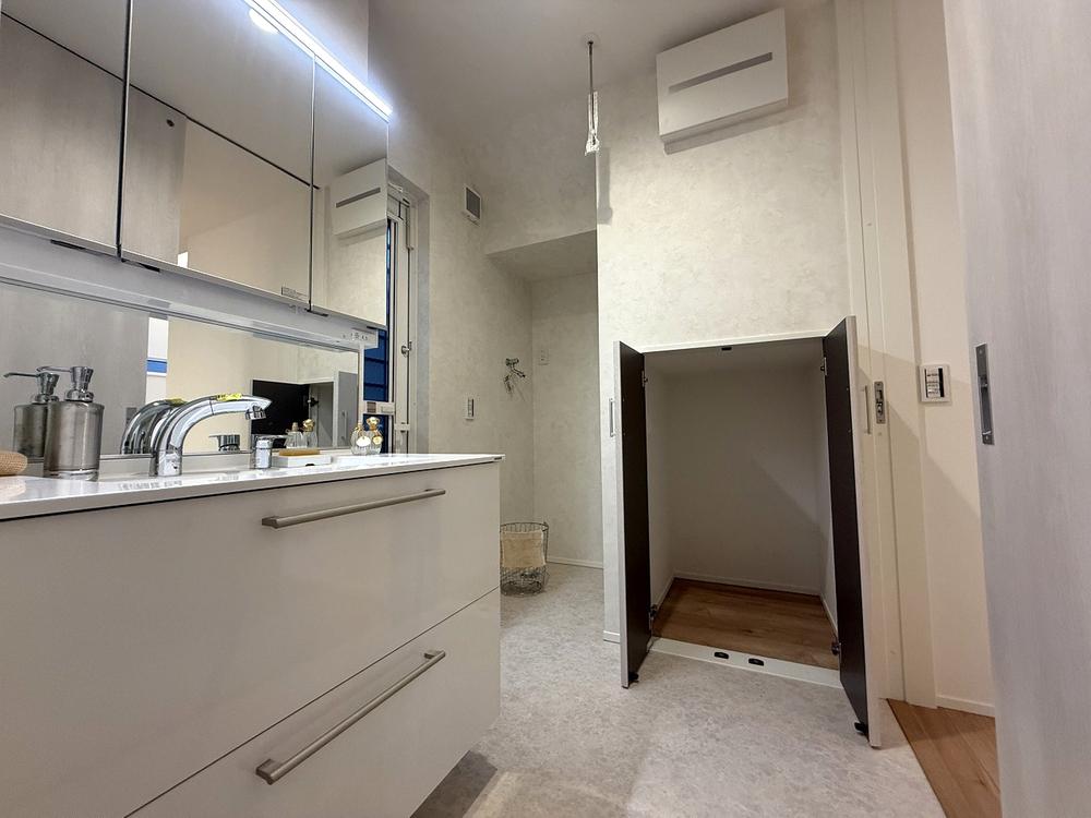 【洗面脱衣室】三面鏡付き洗面台は、鏡を手前に引き出せるので、楽な姿勢で使えます♪洗面脱衣室には、タオルや着替えなど、たっぷり収納できるスペースを確保。毎日の家事や身支度が快適に整います♪