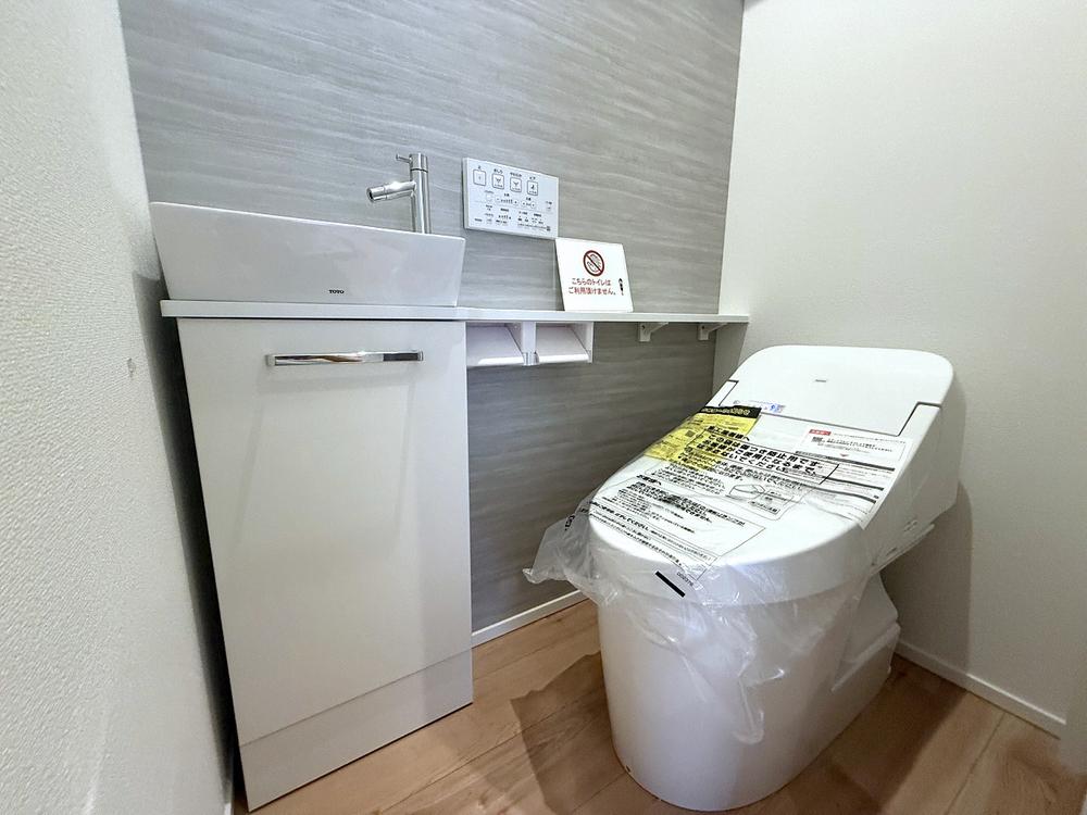 【TOTO製ウォシュレットトイレ】1階には、来客時にも使いやすい独立手洗い器付き。機能性と清掃性に優れた清潔感あるトイレ空間が、快適な毎日をサポートします。グレーのアクセントクロスで清潔感UP◎