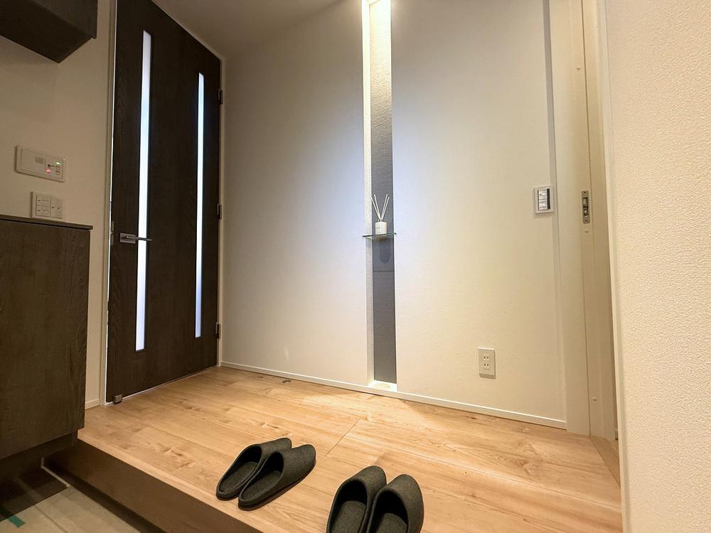 【玄関】ゆとりある玄関スペースと収納力抜群のシューズボックスで、毎日快適に出入りできます。玄関のニッチは、空間にアクセントを加える一工夫。小物を置くだけで、玄関がより上質で居心地のよい空間になります。