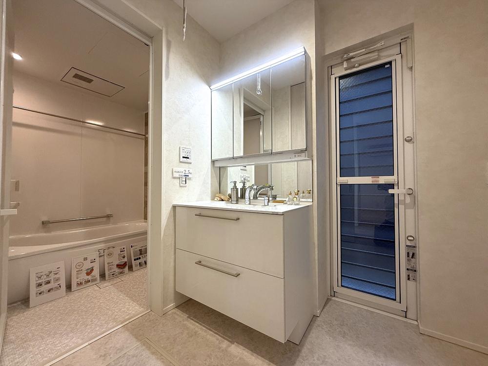 【洗面脱衣室】三面鏡付き洗面台は、鏡を手前に引き出せるので、楽な姿勢で使えます♪洗面脱衣室には、タオルや着替えなど、たっぷり収納できるスペースを確保。毎日の家事や身支度が快適に整います♪
