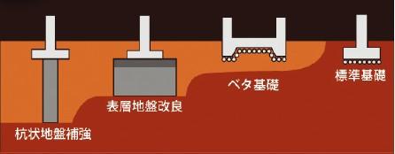 地盤調査の解析結果をもとに、その土地に適した基礎仕様の選定や地盤改良工事を検討します。●直接基礎:地盤の支持力に合わせた計画の基礎を施工●表層地盤改良:表層部の土に固化材を混合し転圧することで地盤を強固にする工法●杭状地盤補強:建物の基礎と支持層の間に杭状の地盤改良や小口径鋼管杭等を施工し建物荷重を支える工法