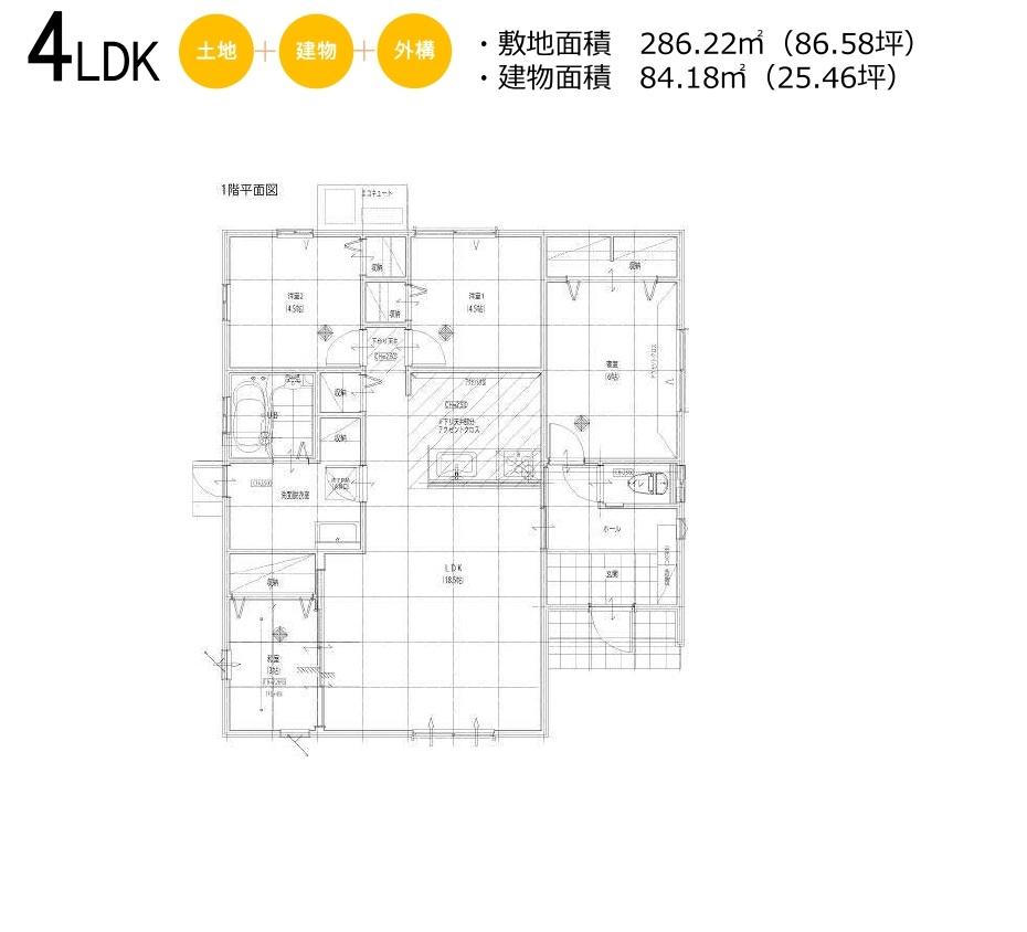 | 建物面積 | 84.18㎡(25.46坪) | 土地面積 | 286.22㎡(86.58坪)(登記) | ||