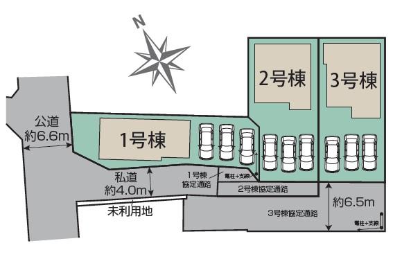 | その他制限事項 | ※建築基準法22条区域 ※地役権設定:通行・水道管に関し1号棟~3号棟の協定道路間であり。協定道路【1号棟】8.63㎡・【2号棟】26.95㎡・【3号棟】136.78㎡ ※未利用地持ち分:7.16㎡×各1/3ずつ ※3号棟東側を隣地電話線が通過しておりますが、移設予定はございません。 | ||||