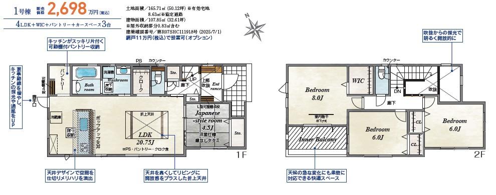 | 建物面積 | 107.85㎡(32.62坪) | 土地面積 | 165.71㎡(50.12坪) | ||