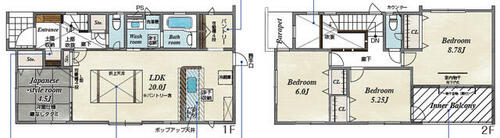 | 設備 | 収納スペース・追焚機能・都市ガス・Wクロゼット・シャンプードレッサー・ウォシュレット・システムキッチン・カウンターキッチン・モニタ付インターホン・クロゼット・トイレ2ヶ所・床下収納・複層ガラス・上水道・下水道・側溝 | ||||