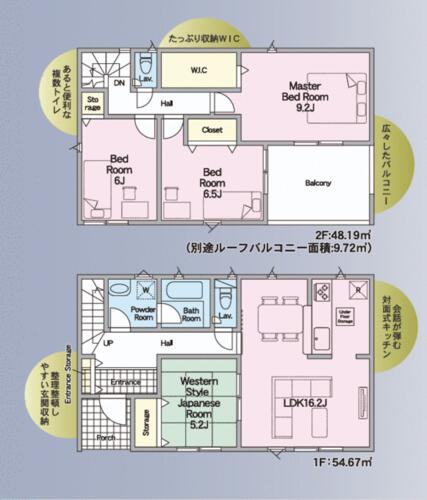 | 設備 | 給湯・追焚機能・プロパンガス・浴室乾燥機・Wクロゼット・シャンプードレッサー・ウォシュレット・システムキッチン・カウンターキッチン・モニタ付インターホン・クロゼット・トイレ2ヶ所・床下収納・ルーフバルコニー・浄水器・ディンプルキー・電気・上水道・下水道・省エネ給湯器 | ||||