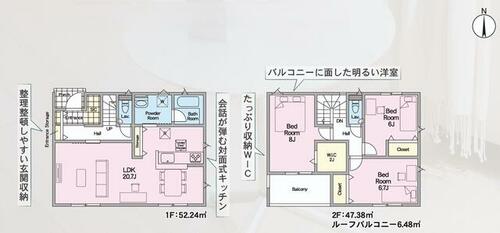 | 設備 | 給湯・収納スペース・追焚機能・プロパンガス・浴室乾燥機・Wクロゼット・シャンプードレッサー・ウォシュレット・システムキッチン・カウンターキッチン・モニタ付インターホン・庭・クロゼット・トイレ2ヶ所・床下収納・浄水器・複層ガラス・ディンプルキー・電気・上水道・下水道・側溝・省エネ給湯器 | ||||