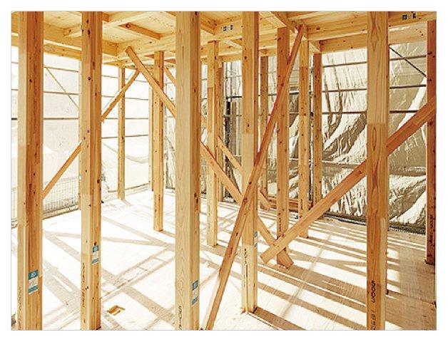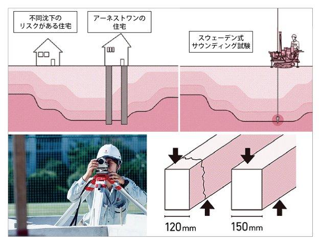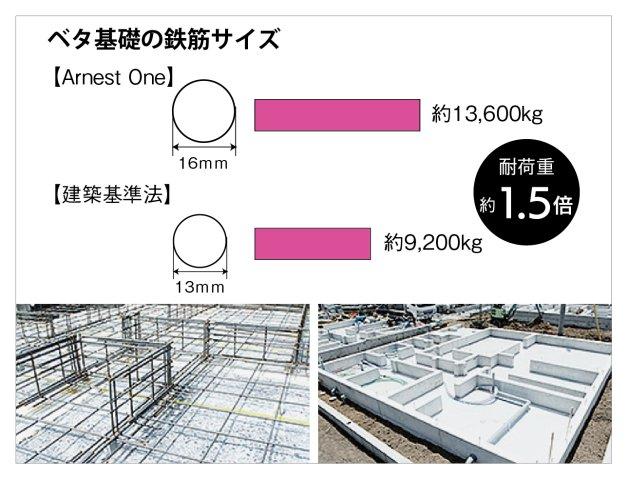 通常の木造住宅のベタ基礎工事においては、13mm鉄筋が多く使われます。しかし、当社では自主基準として全戸の基礎の主筋に16mm鉄筋を採用。16mm鉄筋を用いて子会社アーネストウイング社によって生産されるユニット鉄筋を使用した基礎は、強度比較試験において建築基準法で定められた配筋による基礎の強度を大きく上回っています。
