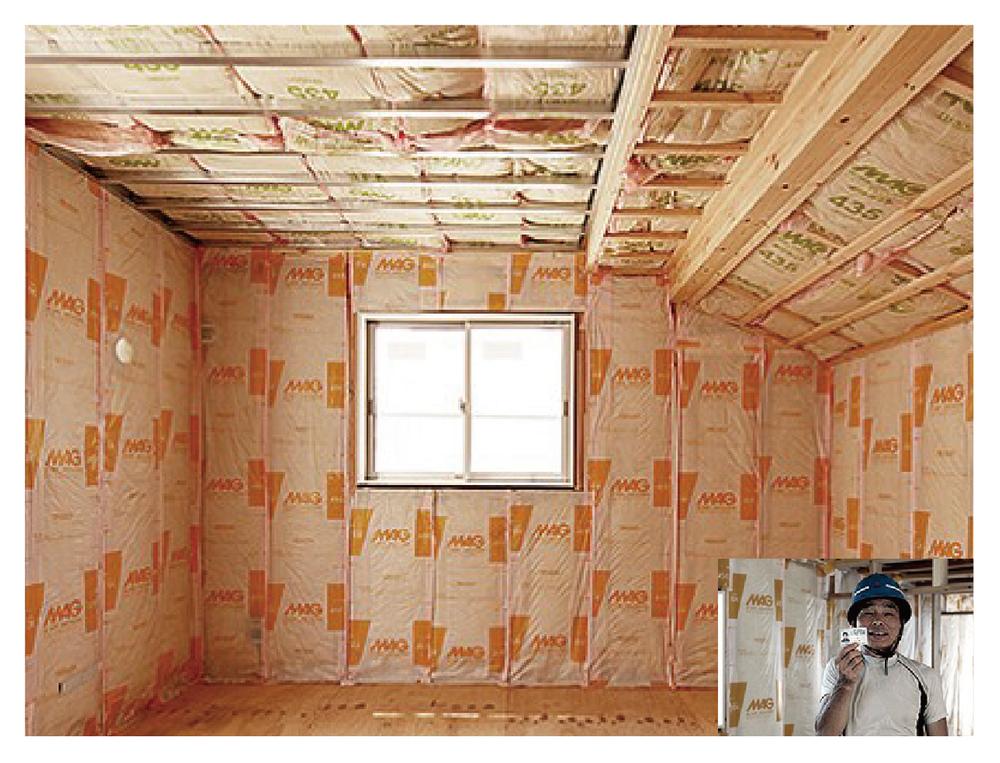 グラスウール断熱材はキレイに貼れないと断熱効果が落ちます。時には、結露で家にダメージを与えてしまう可能性もあります。そこで、当社では社員や職人さんにガラス繊維協会の実践するマイスター認定の取得を奨励しています。同時に、断熱材自体の貼りやすさの研究も行い、キレイに貼りやすい断熱材の開発と貼り方の施工技術を構築し、実践しています。