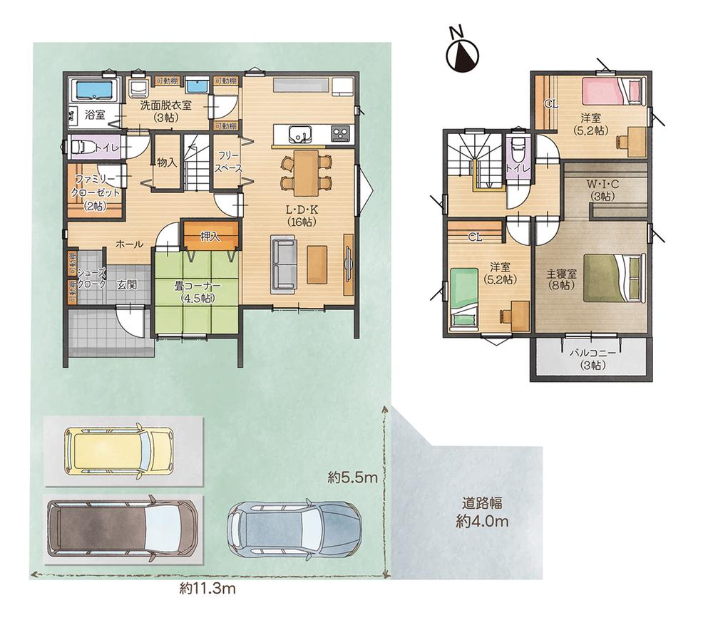 | 建物面積 | 115.95㎡・118.01㎡(35.07坪・35.69坪)(実測) | 土地面積 | 178.68㎡・189.86㎡(54.05坪・57.43坪)(実測) | ||