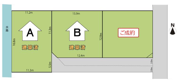 | 地目 | 宅地 | 道路付け | 道路幅:7.2m、アスファルト舗装、私道:50.75㎡~62.23㎡ 地役権:50.75㎡~62.23㎡ | ||