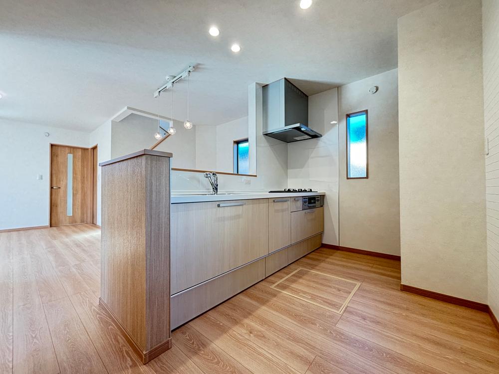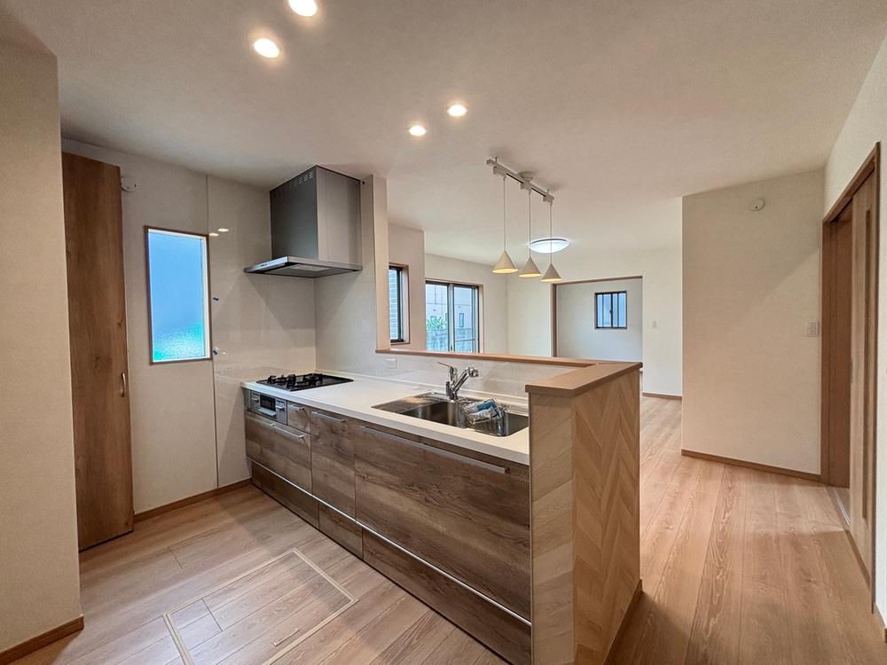 【7号棟 キッチン】横幅約2.55mの広々としたシステムキッチンは、二人並んでお料理してもゆとりがあります!たっぷりの収納と作業スペースで、毎日のお料理がもっと楽しくなりそうですね♪家族との会話も弾む対面