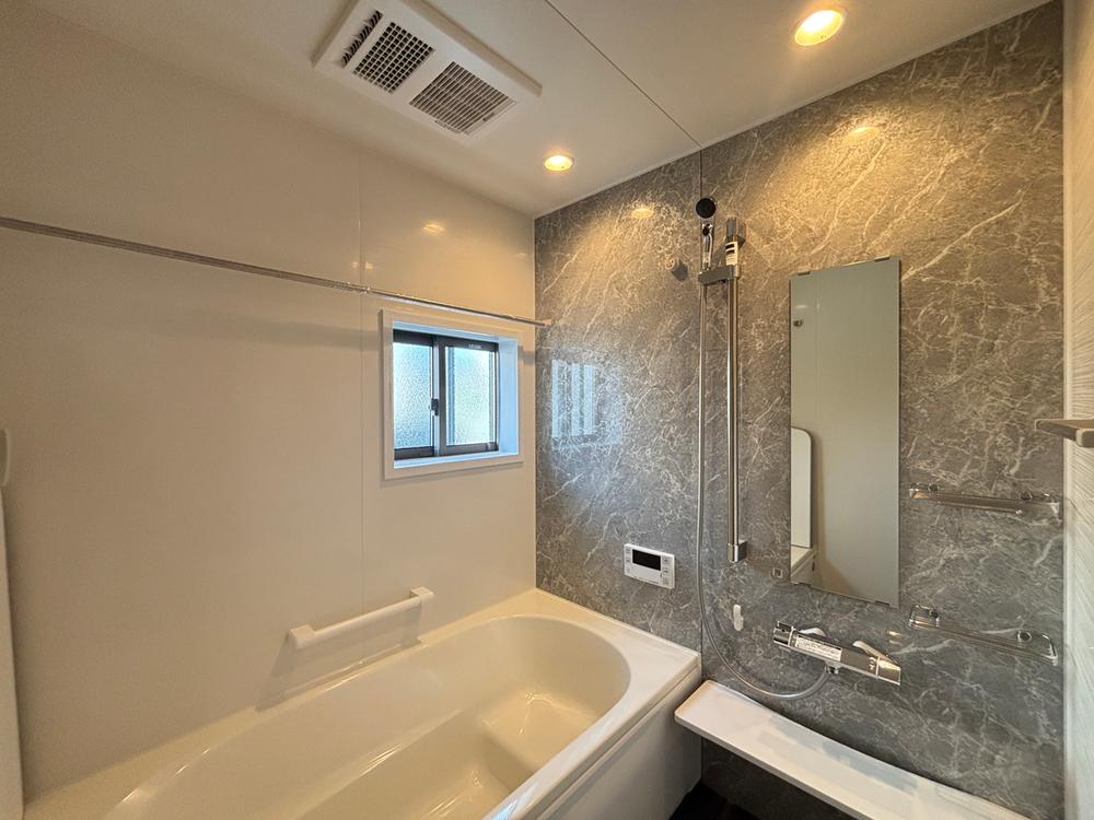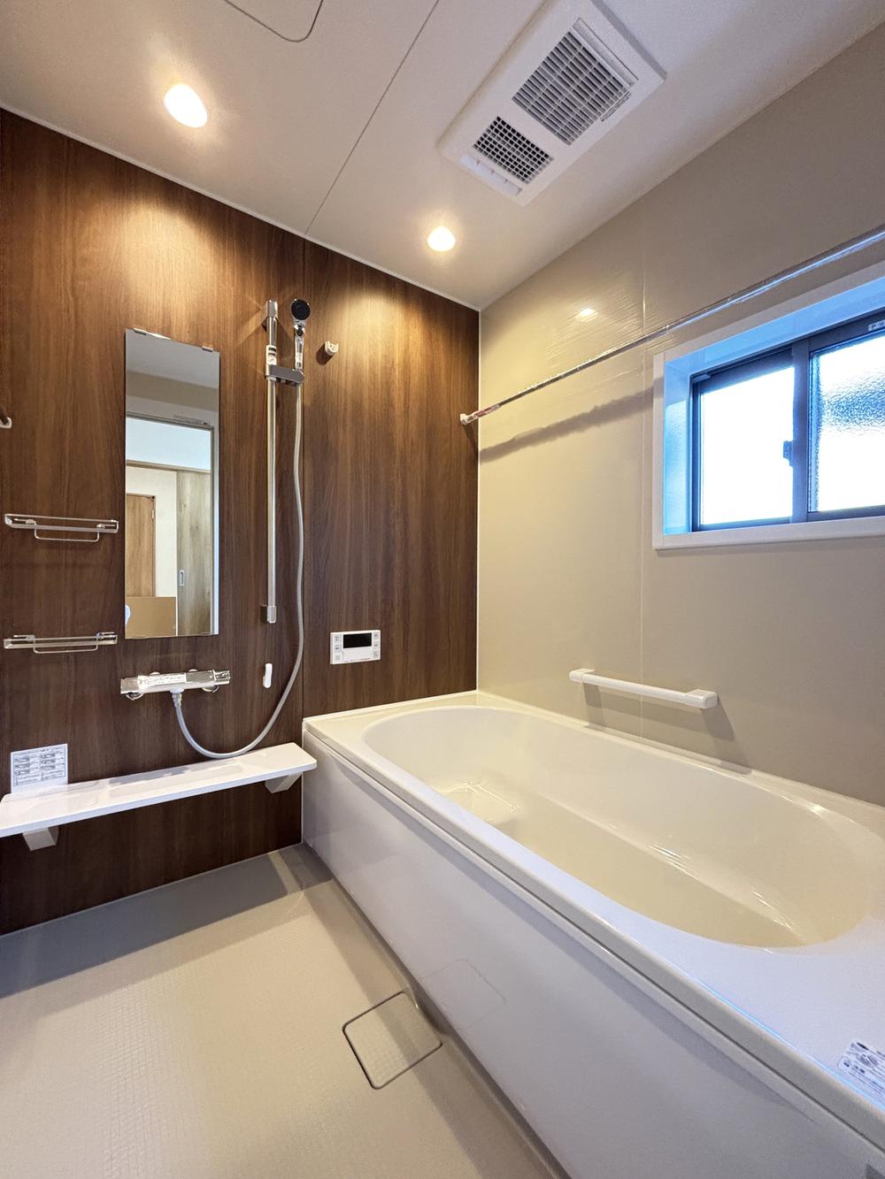 【7号棟 浴室】ゆったりとしたユニットバスは、一日の疲れを癒やすリラックス空間です!おしゃれなアクセントパネルが落ち着いた雰囲気を演出していますね♪大きな浴槽で、お子様とのバスタイムも楽しめます!