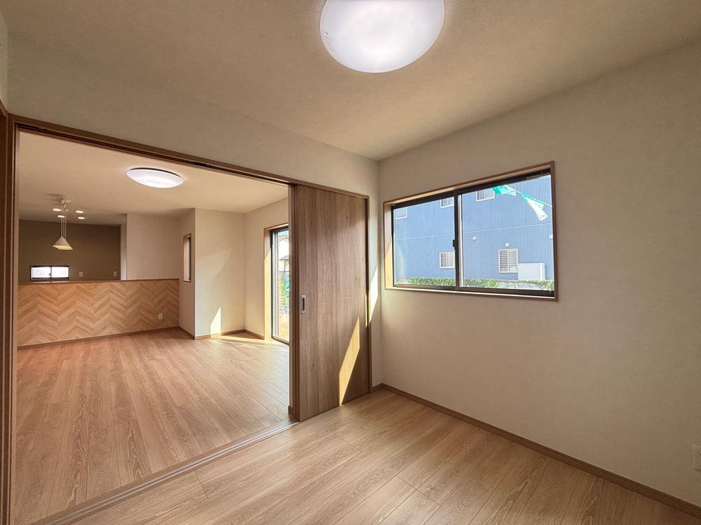 【7号棟 1F洋室】二面採光で明るく風通しの良い洋室です!スライド式の扉で仕切られているので、リビングと繋げて広々とした空間としても利用できますね♪お子様の遊び場や寝室にもぴったりの空間です!