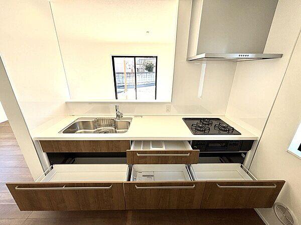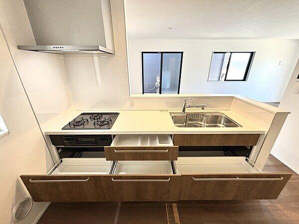 | 設備 | 駐車2台可 / 駐車3台以上可 / システムキッチン / 浴室乾燥機 / 全居室収納 / 南側道路面す / LDK15畳以上 / シャワー付洗面化粧台 / 対面式キッチン / トイレ2ヶ所 / 浴室1坪以上 / 2階建 / 複層ガラス / 温水洗浄便座 / 通風良好 / ウォークインクローゼット / 浄水器 | ||||
