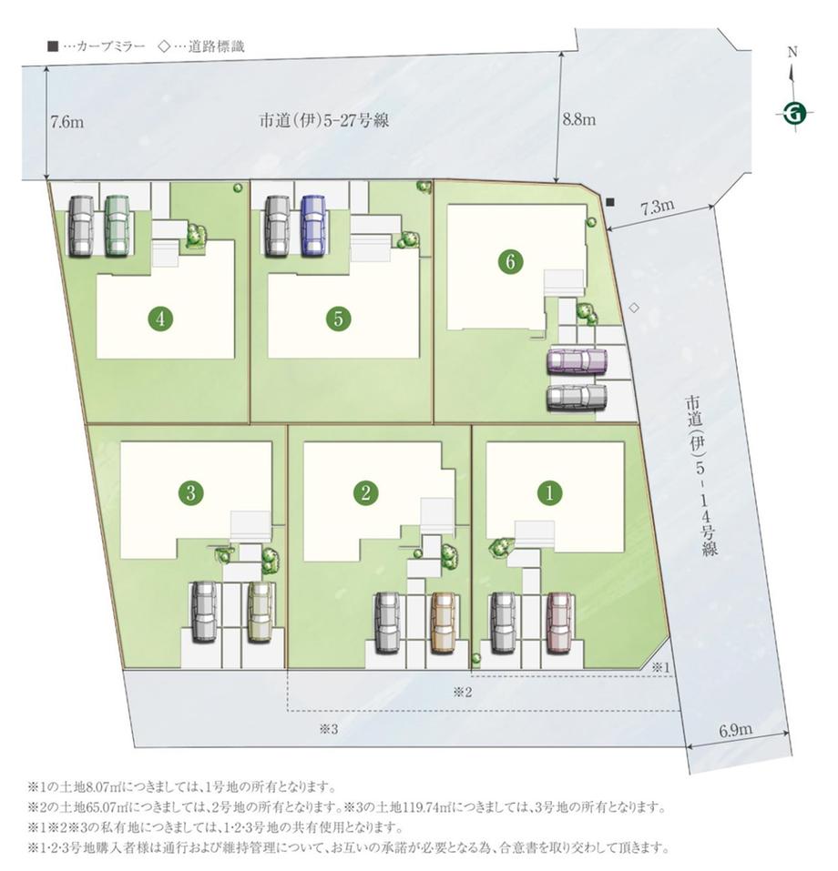 | 地目 | 宅地 | 道路付け | 道路幅:6.9m~7.3m、アスファルト舗装、7.6m~8.8m幅員アスファルト舗装 | ||