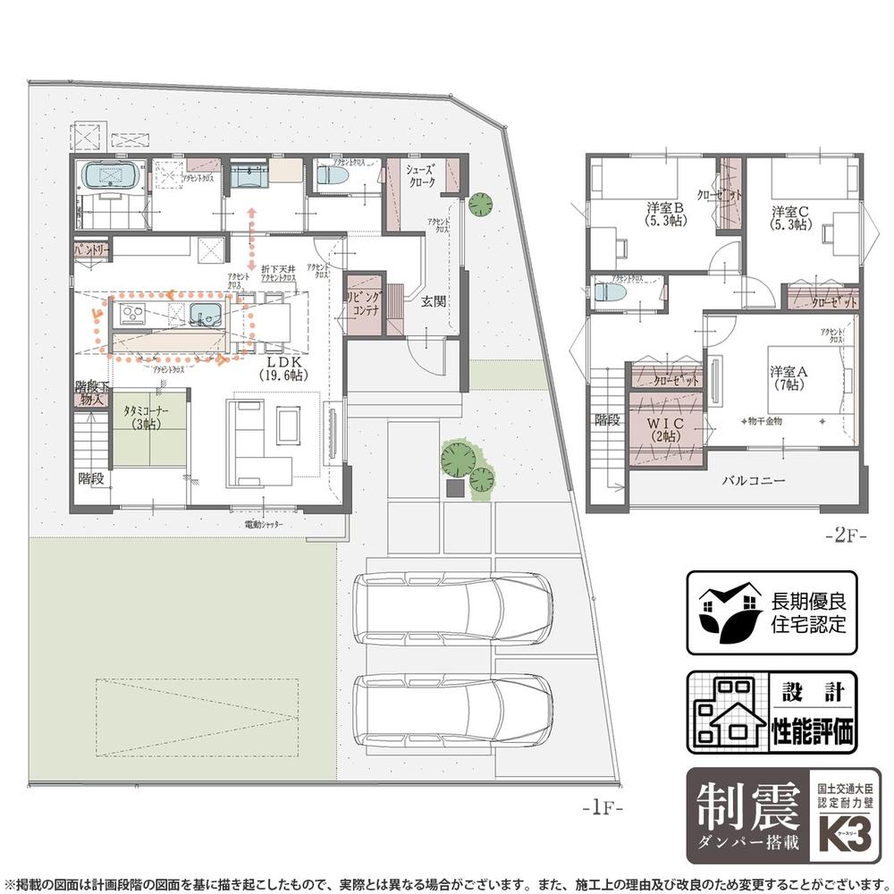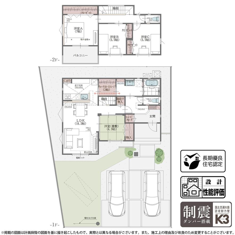| 設備 | 長期優良住宅認定通知書 / 設計住宅性能評価書 / 省エネルギー対策 / 地盤調査済 / 駐車2台可 / 土地50坪以上 / LDK18畳以上 / 省エネ給湯器 / スーパー 徒歩10分以内 / 南向き / システムキッチン / 浴室乾燥機 / 陽当り良好 / 全居室収納 / 南側道路面す / 前道6m以上 / 角地 / 和室 / 整形地 / 庭 / シャワー付洗面化粧台 / 対面式キッチン / ワイドバルコニー / バリアフリー / トイレ2ヶ所 / 浴室1坪以上 / 2階建 / 南面バルコニー / 複層ガラス / 全室南向き / オートバス / 温水洗浄便座 / 浴室に窓 / TVモニタ付インターホン / 節水型トイレ / 全居室フローリング / パントリー(食器・食品の収納庫) / ウォークインクローゼット / IHクッキングヒーター / リビング階段 / 全居室複層ガラスか複層サッシ / シューズインクローク / 食器洗乾燥機 / オール電化 / 浄水器 / スマートキー / 高機能トイレ | ||||
