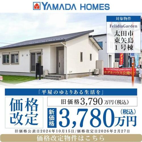 | 備考 | 価格改定!販売価格3,790万円→3,780万円(旧価格公表日:2024年10月15日 新価格公表日:2026年2月27日)・施工会社:株式会社ヤマダホームズ・【ヤマダホームズ】がお届けする新築分譲戸建て(平屋)が太田市東矢島町に誕生しました!(1号棟)断熱性能5等級!LDK18帖、リビングはお洒落な勾配天井、スーパーやドラッグストアまで徒歩5分! | ||||