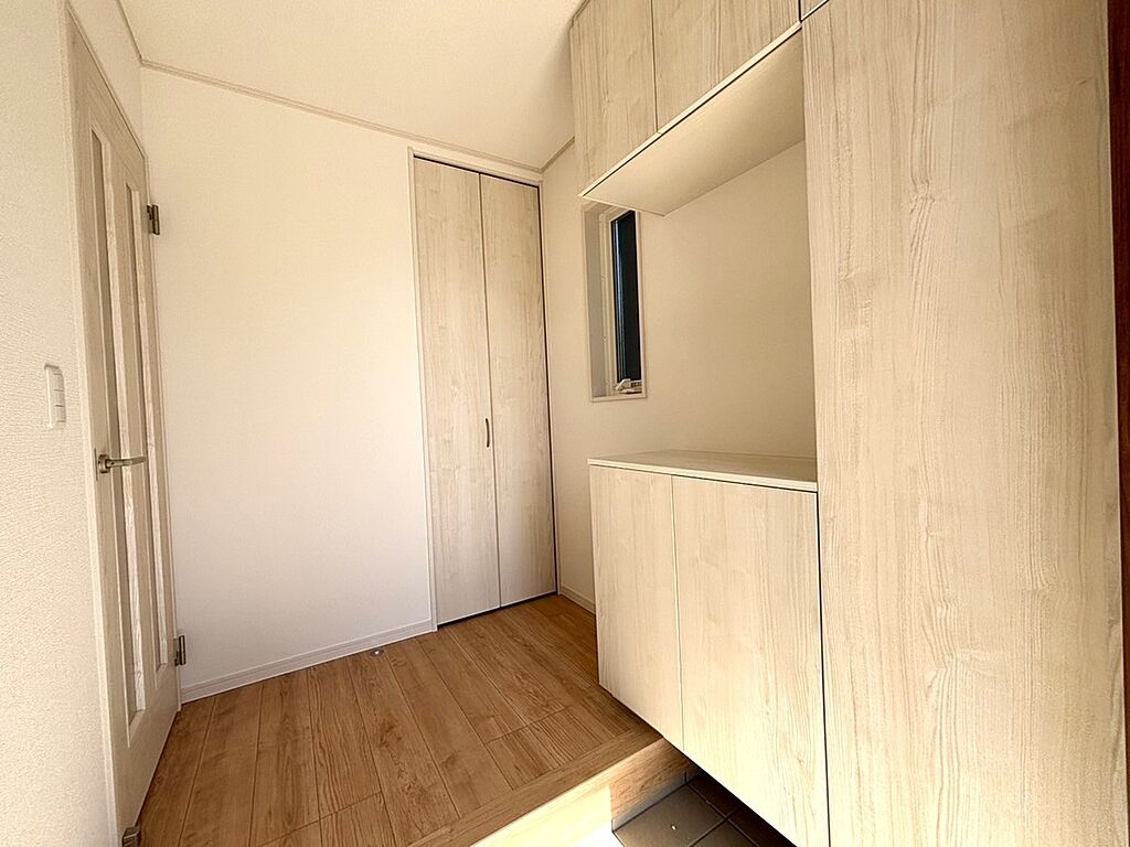 玄関を開ければ、明るいホールが出迎えてくれます。コの字型の収納は家族の靴を約60足収納可能です。土間収納もありますので、ベビーカーやスポーツ用品などもスッキリ収納可能。(2025年1月12日撮影)