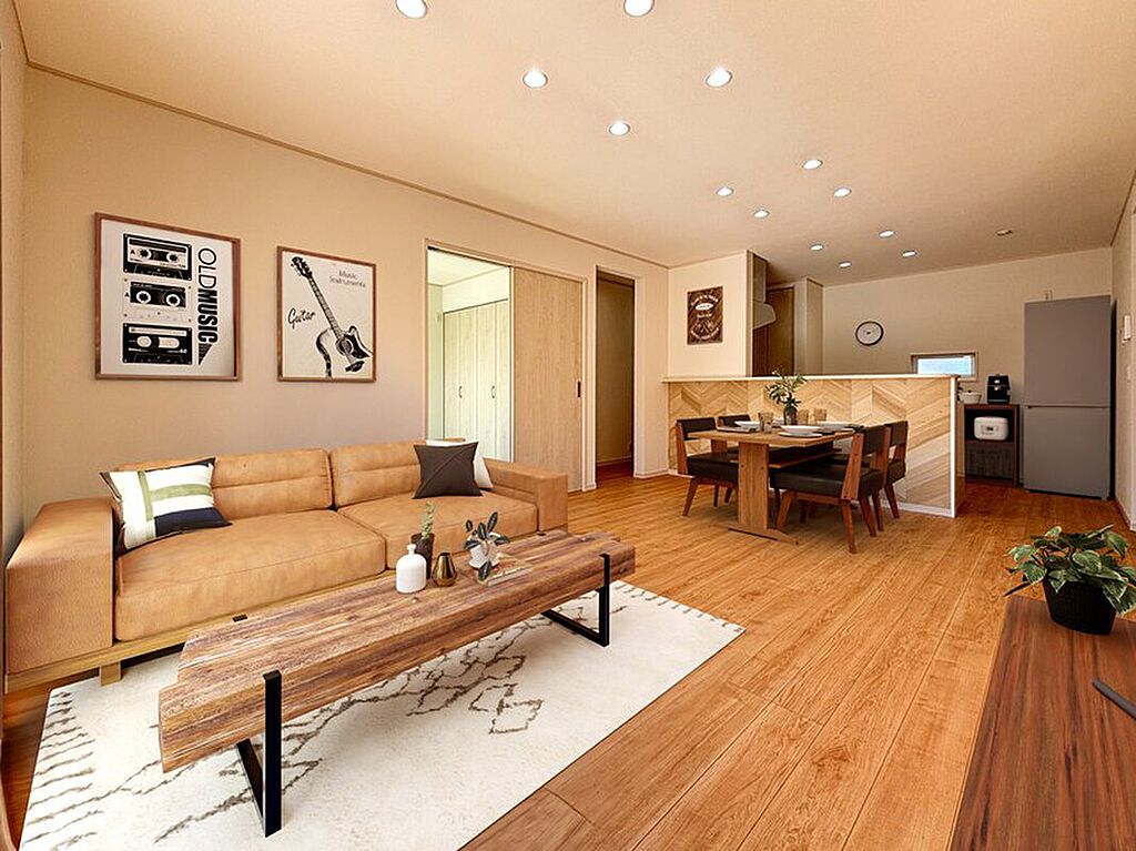 リビングは、家族とのコミニュケーションをとりながら寛げる憩いの場となりますね(この画像は実際の室内写真にインテリアをCGで合成したものです。実際の物件には家具は配置されておりません)