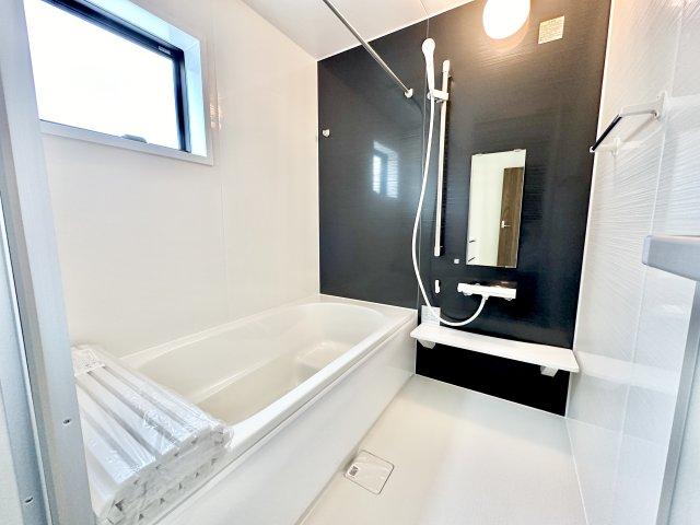 アクセントパネルで落ち着きのある雰囲気を演出したバスルーム♪毎日の疲れを癒やすバスタイムをお楽しみ下さい!浴室換気乾燥暖房機付きで、ジメジメした季節や雨の日には、浴室内干しも可能!