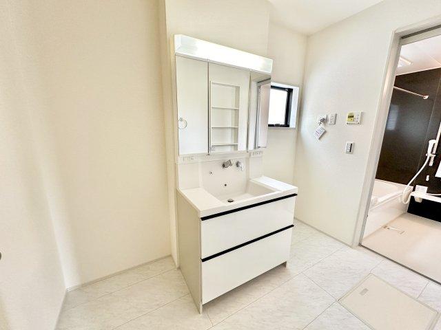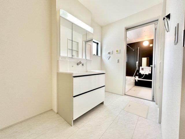 広く、明るい洗面スペースで朝の身支度も快適に♪3面鏡で髪のセットやお化粧もストレスなくこなせ、鏡の裏にはたっぷりと収納スペースを標準装備!