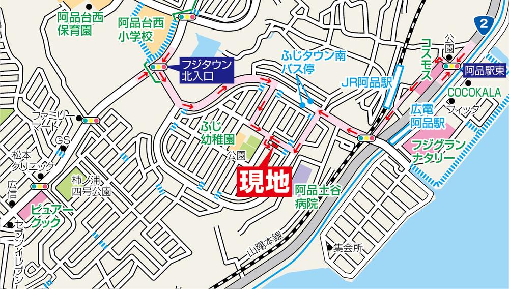 広島電鉄宮島線「広電阿品」歩7分 廿日市市「ふじタウン南バス停」歩5分 JR山陽本線「阿品」歩9分 | ||||