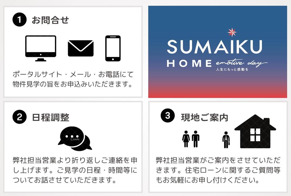 モデルルーム情報 | 現地見学会(事前に必ず予約してください)日程/公開中現地案内会(事前に必ずお問い合わせください)日程/公開中◆ご案内方法◆ご自宅⇔物件間の送迎、弊社へのご来社など、お気軽にご相談くださいませ♪平日・休日祝日問わずご内見にお付き合いをさせていただきます。電気が通っている物件は夜間のご内見も可能です。◆お問合わせ物件以外のご紹介・ご案内◆インターネットに掲載していない物件や未公開物件、注文へシフトされる方に土地のご紹介や弊社モデルハウスのご案内も行っております♪様々なところから連絡がきて困る!といった場合、お問合せを一本化するとスムースです☆他社様掲載の物件でもご紹介(ご案内)可能ですので、お気軽にお問い合わせください。◆内見希望・来社のご予約方法◆時間が出来たし、ちょっと見てみようかな?と思ったらお気軽にお電話をください♪既に営業担当がついている場合は、携帯電話にご連絡を頂いても結構です☆◆営業スタッフからのアプローチに関して◆『紙ベースの資料が欲しい』『訪問は避けて欲しい』『LINEで連絡をとりたい』etcお客様のご希望に合わせた方法でご連絡させて頂きます。◆とっても大事な住宅ローンのご相談◆車のローン、奨学金、他に借入がある、実は返し忘れが・・・等々一般的なご質問~言いにくいご相談まで住宅ローンアドバイザーがご対応させていただきます♪おまとめローンは当たり前。金利の比較相談などお気軽にお申し付けくださいませ☆まずは、お気軽にお問合せをどうぞ☆ | ||||