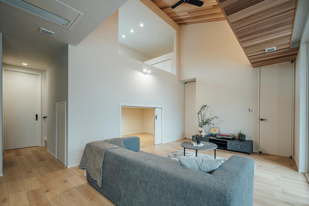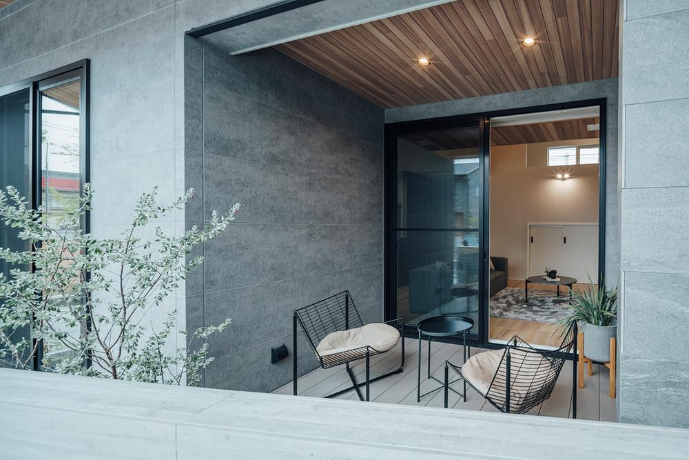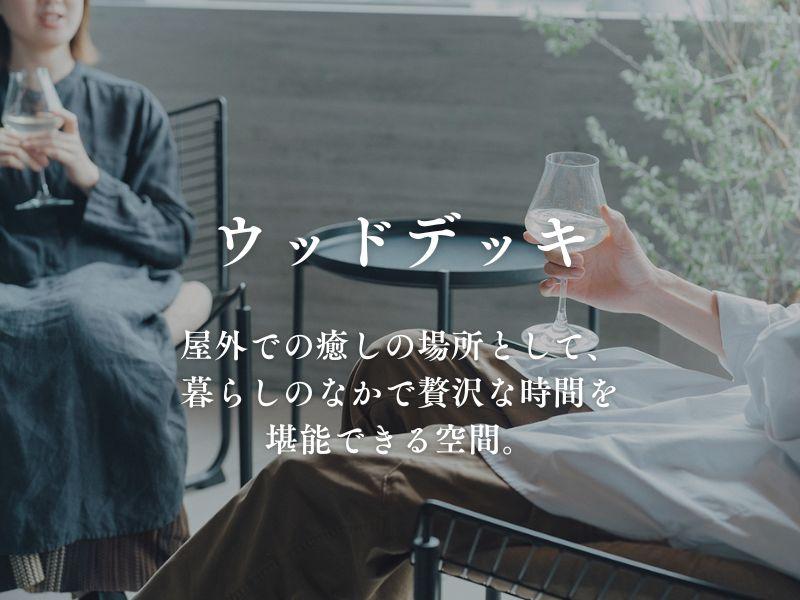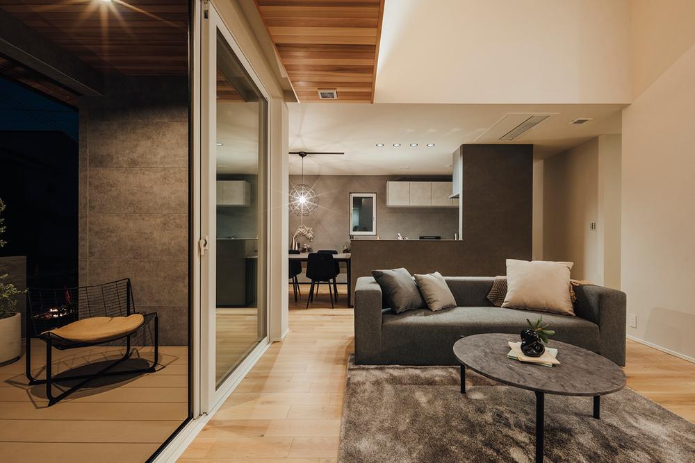 リビング続きのウッドデッキは、室内の心地よさをそのまま外に延長した、半アウトドアのくつろぎ空間です。ソファで音楽を楽しんだ延長で外に一歩出て、夕景を眺めながら一杯。光と風を感じながら、ホテルラウンジのような時間を自宅で愉しめます。