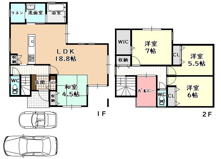 | 設備 | 駐車2台可 / LDK18畳以上 / システムキッチン / 駅まで平坦 / 和室 / シャワー付洗面化粧台 / 対面式キッチン / トイレ2ヶ所 / 2階建 / 温水洗浄便座 / 床下収納 / 浴室に窓 / パントリー(食器・食品の収納庫) / ウォークインクローゼット / IHクッキングヒーター / シューズインクローク / 小学校 徒歩10分以内 / 平坦地 / オール電化 | ||||