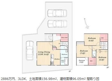 | 設備 | 駐車3台以上可 / 全居室収納 / LDK15畳以上 / 2階建 / ウォークインクローゼット / 全居室6畳以上 | ||||